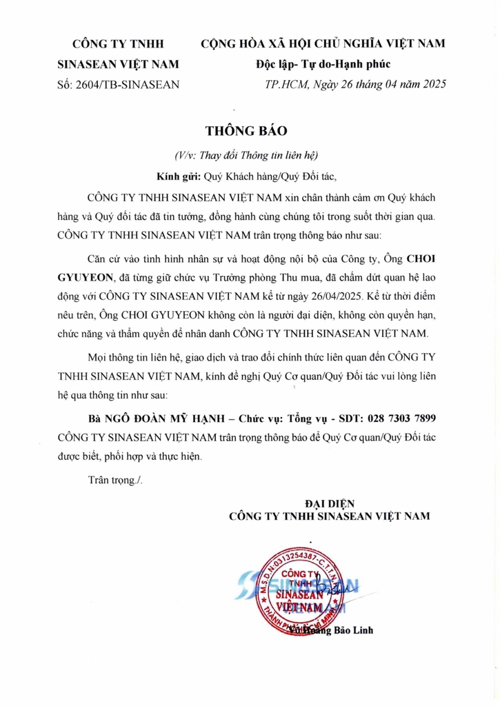 Căn cứ quyết định nhân sự của Công ty, ông CHOI GYU YEON, nguyên Trưởng phòng Thu mua, đã chấm dứt quan hệ lao động với Công ty TNHH SINASEAN VIỆT NAM kể từ ngày 26/04/2025.